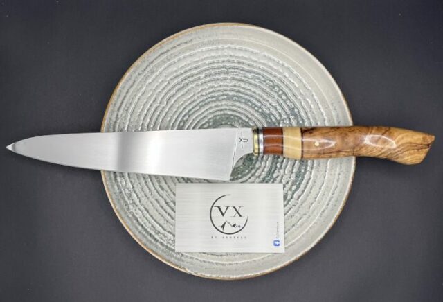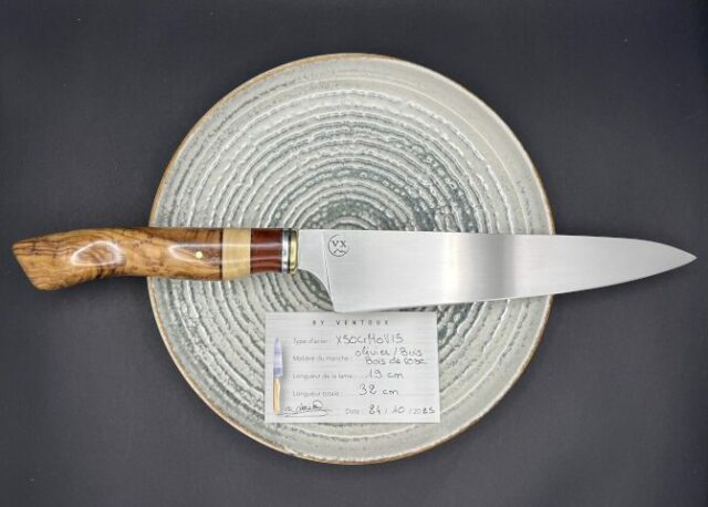 Le manche en olivier, buis et bois de rose apporte une sensation chaleureuse en main, avec un assemblage soigné qui met en valeur le travail artisanal.