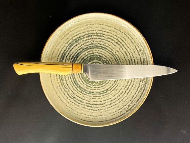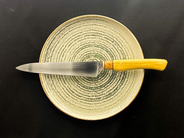 Le manche en buis, avec son insertion de résine noire, allie sobriété et élégance. Sa teinte claire et son veinage discret soulignent la pureté de la ligne, tout en offrant une prise en main confortable.