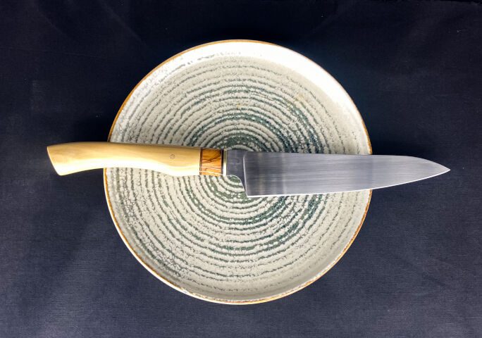 Sa résistance permet un bon maintien du tranchant sur la durée, avec son manche en buis surmonté d’un bague en olivier , il s’adaptera parfaitement à vos réalisations culinaire.