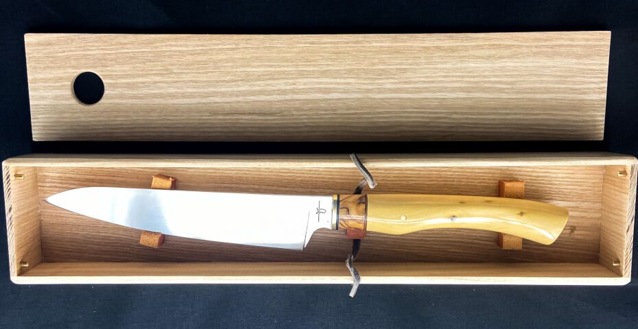 J’ai façonné cette pièce dans l’optique de créer un couteau pour un usage quotidien. Sa lame fine de 16 cm permet aussi bien la découpe de la viande, des légumes en gros morceaux ou d’émincer finement un oignon. Celle ci est réalisée en acier 14C28N, ses propriétés inoxydable n’impose pas un entretien rigoureux et un séchage complet après nettoyage.