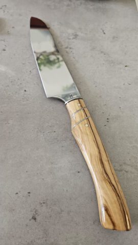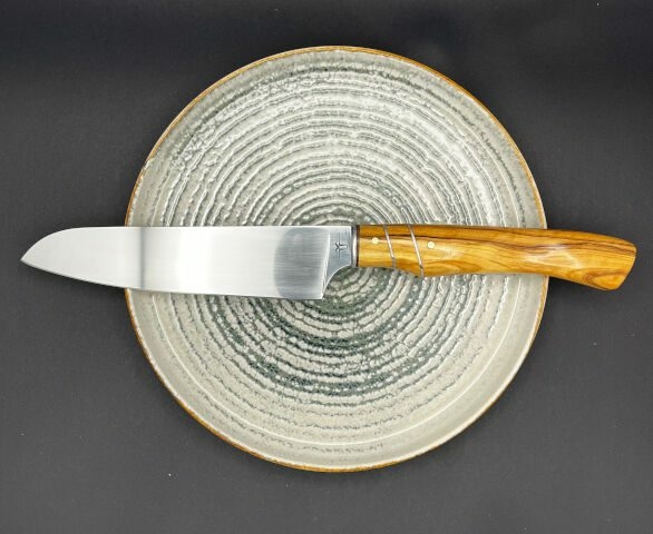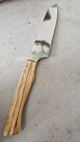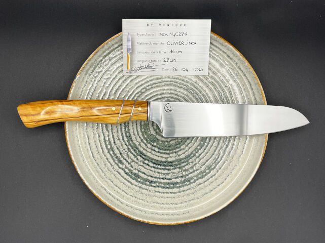 Piece artisanale confectionné dans notre atelier, sa lame de 16 cm en acier inoxydable 14C28N associée à un manche en olivier avec empiècement inox pour un rendu a la fois chaleureux et moderne.